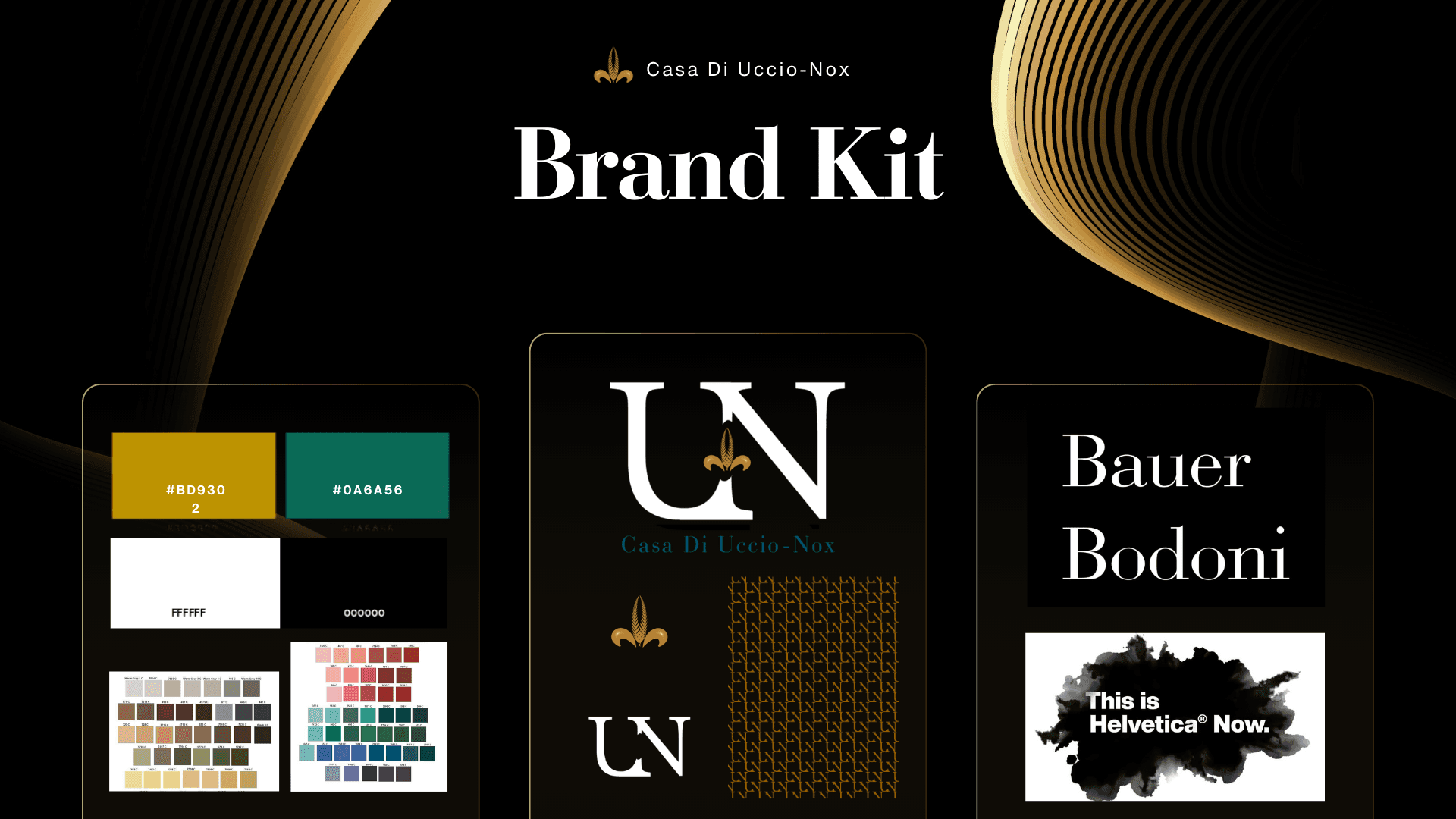 The brand kit translates the collaboration into a tangible design system, utilizing a palette of deep forest green, regal gold, and stark monochromatic tones. The "UN" monogram and the fleur-de-lis accent serve as a new heraldry, marrying classical nobility with contemporary sharp-edged typography like Bauer Bodoni and Helvetica Now. It showcases the technical discipline required to maintain brand consistency across different textures and scales.